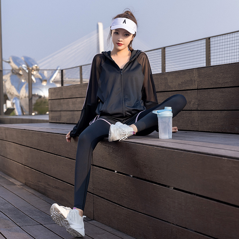 通気性に優れたメッシュ素材を使用した軽量ジャケットとハイウエストレギンスの組み合わせ。