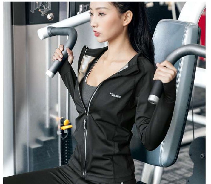 上着はスマートなジッパー仕様で着脱が簡単、クロップトップとレギンスの組み合わせが機能的です。