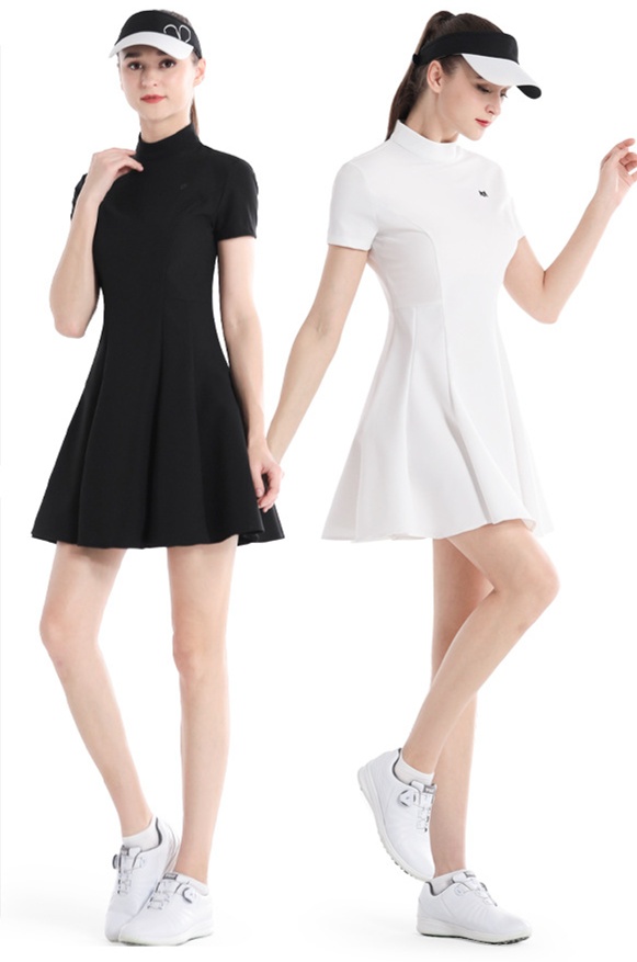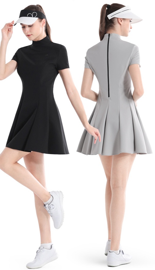 高機能素材を使用したスポーツワンピースで、モックネックデザインが上品な印象を与えます。